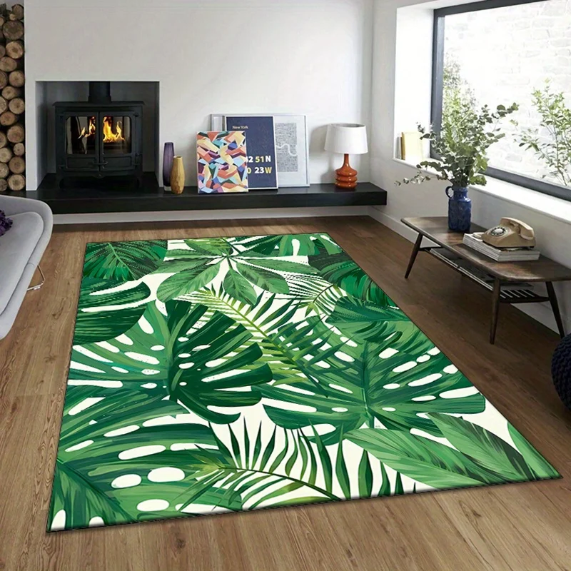 Tropical Leaf Area Rug, Crystal Velvet, Non Slip Mat, Green White Design