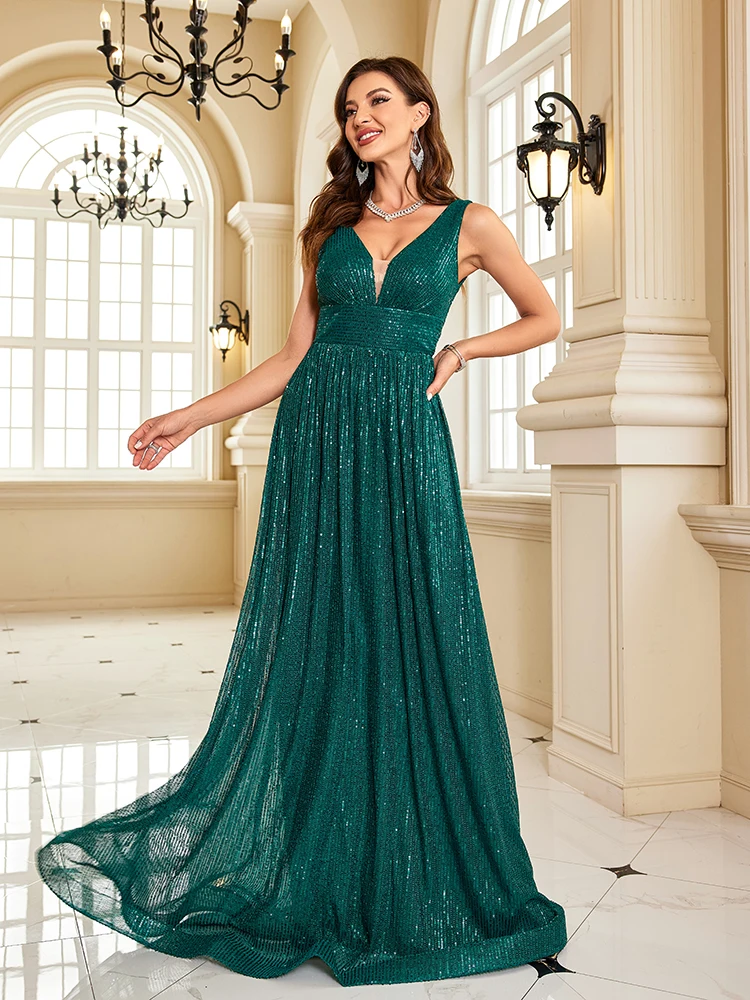 Women Luxury V-Neck Sleeveless Green Formal Evening Dress
