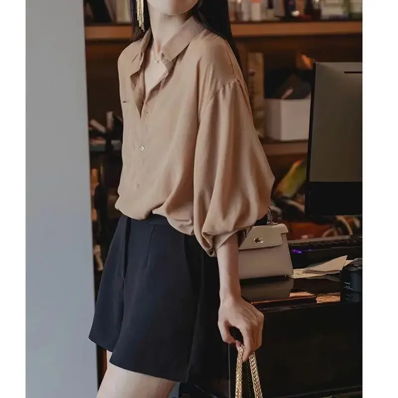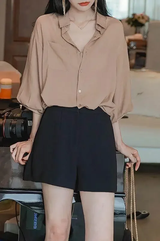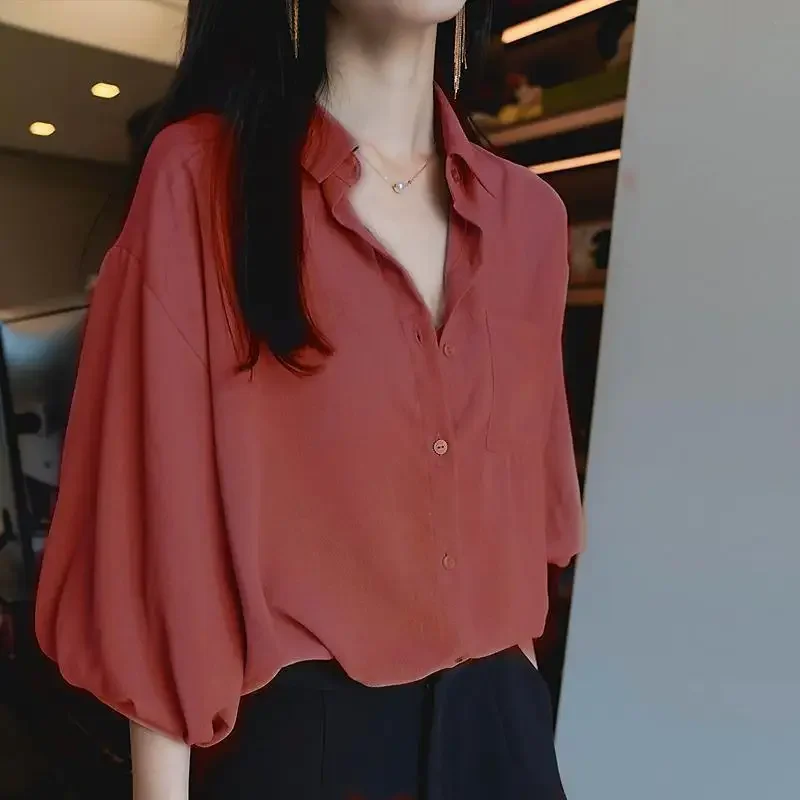 Women’s Loose V-Neck Chiffon Tunic – Lantern Sleeve Korean Style Top