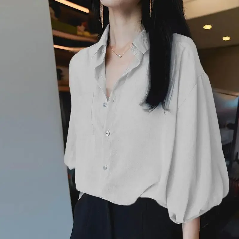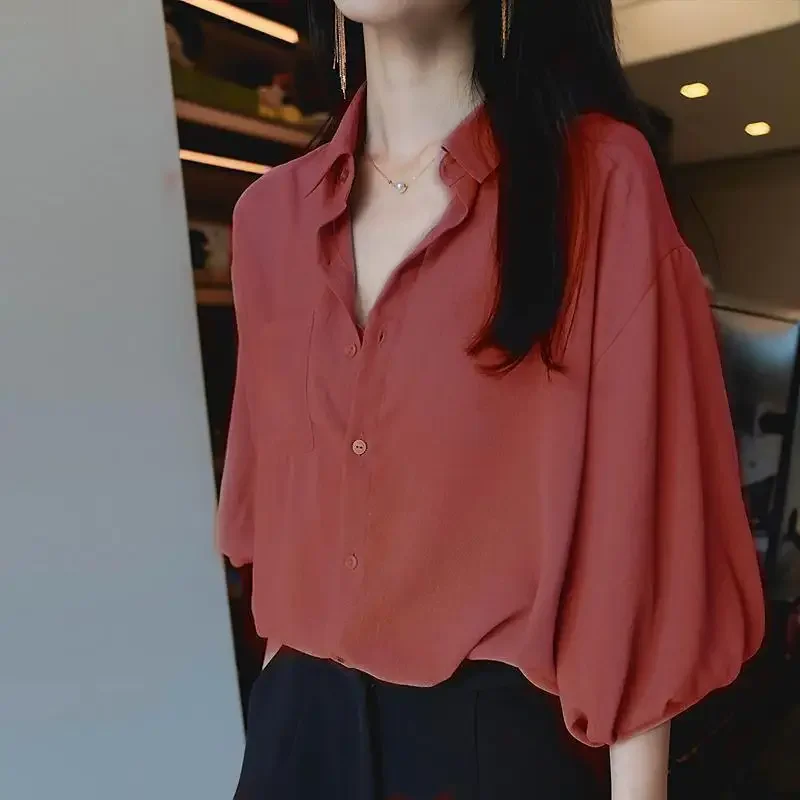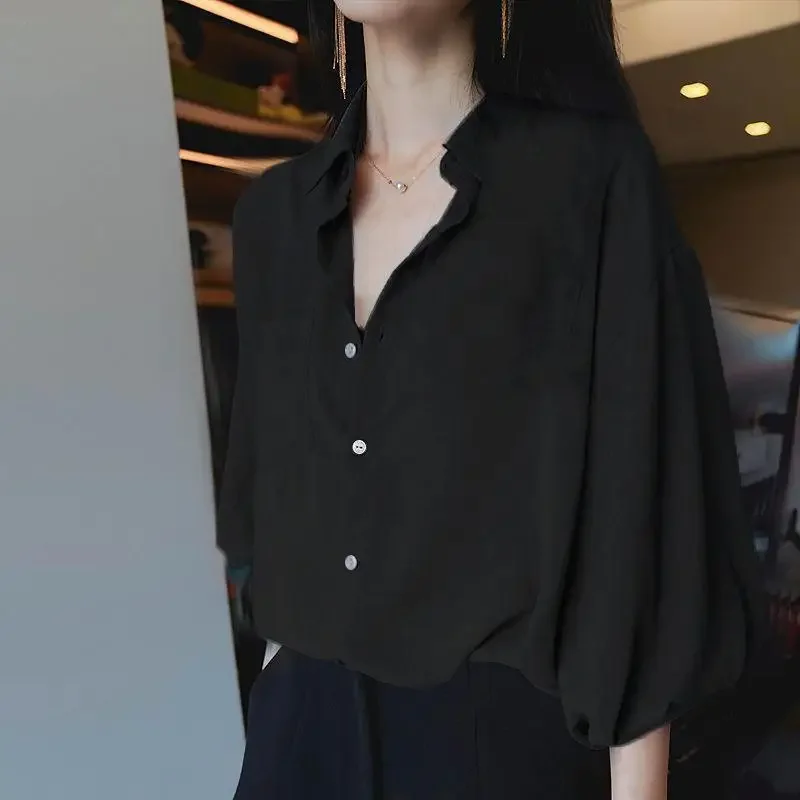 Women’s Loose V-Neck Chiffon Tunic – Lantern Sleeve Korean Style Top